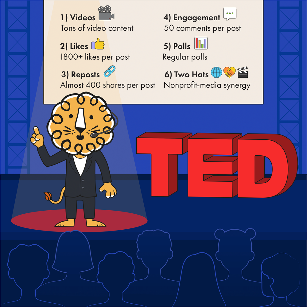 Let’s meet the frontrunners of the social media relay. Our champion is TED, which is famous for its international online talks and conferences. It boasts the largest cross-platform follower count of 14 million, the highest average shares per post, and an average number of daily views.