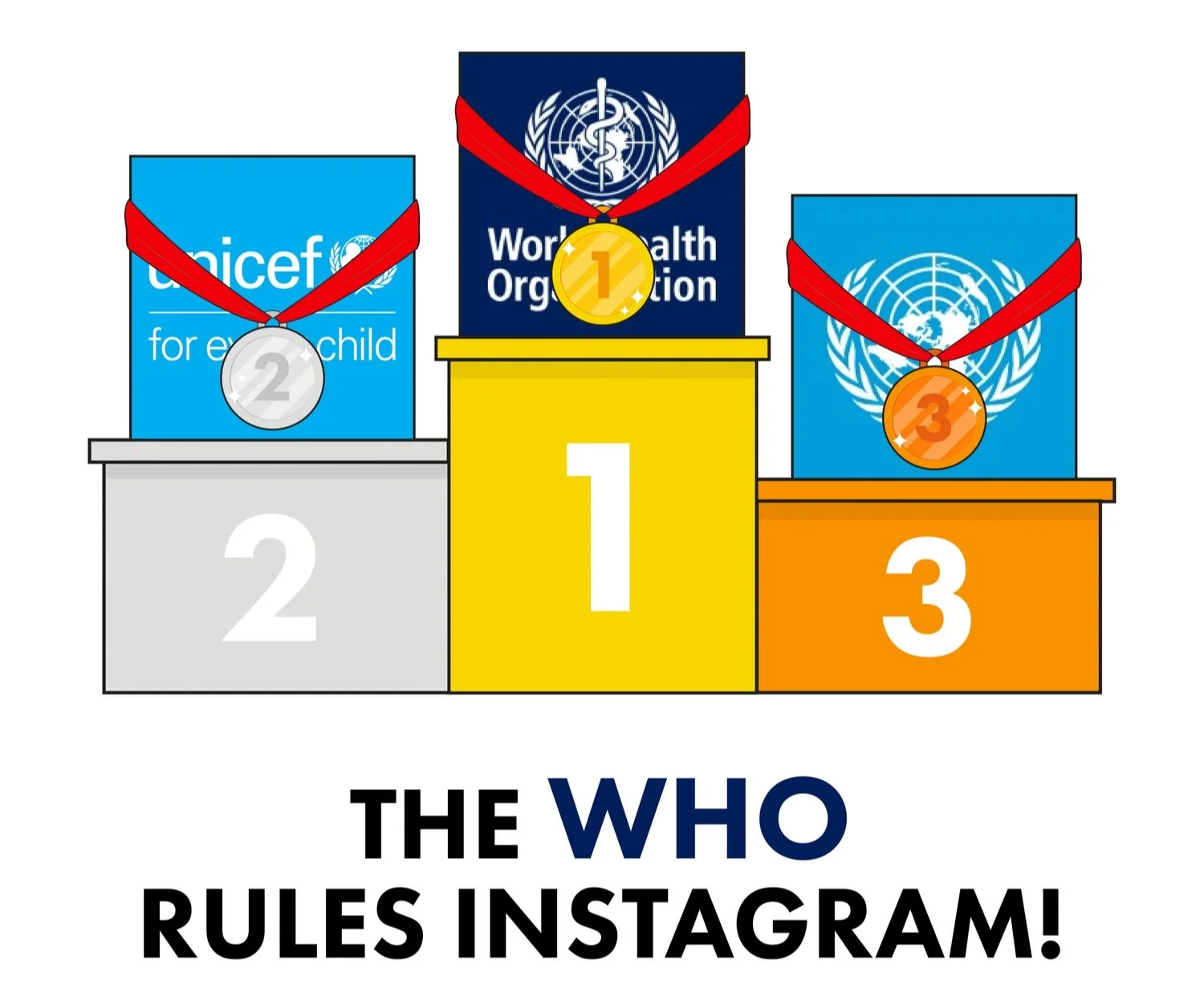 The World Health Organization comes in first again with 12.1 million followers, UNICEF is second with 11.5 million, and the UN is third with 8 million followers.